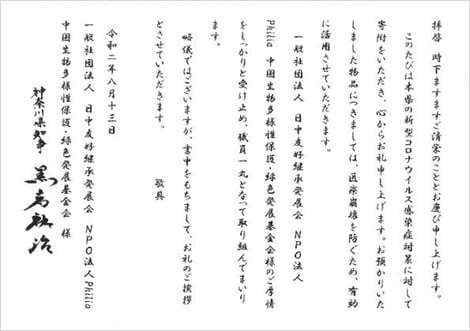 (2)その後、日本における感染拡大が深刻になった5月頃には、中国生物多様性保護・緑色発展基金会より10万枚、在日本中国大使館より2千枚等のマスクの寄贈を受け、当方で手配したハンドウォッシュやフェイスシールドと併せて東京都、神奈川県、杉並区等の自治体や病院などに寄付した。